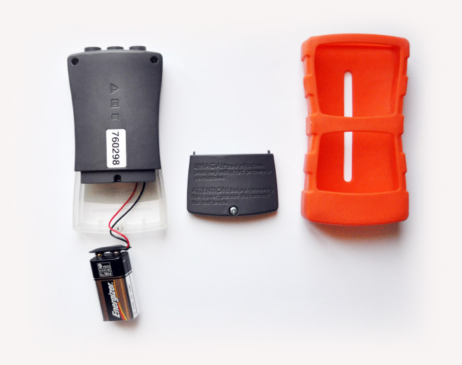 Давайте разберемся, в чем же принципиальные отличия данной модели от TKF-12. Корпус выполнен из такого же пластика и имеет защитный чехол. На передней панели расположена клавиша включения питания. В отличие от 12-ой модели, здесь питание осуществляется от батарейки 9V 6LR61 «крона». При этом выключение указателя происходит только в автоматическом режиме через 5 минут «бездействия». Рядом с клавишей расположены два индикатора — включенного питания и низкого уровня заряда элементов питания.