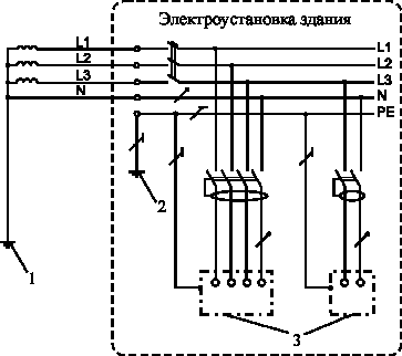 1 — заземление источника питания (на подстанции); 2 — защитное заземление электроустановки здания (во вводном щите); 3 — открытые проводящие части.