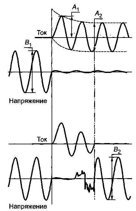 Примечание - Амплитуда записи напряжения после подачи испытательного тока изменяется в зависимости от относительного положения замыкающего устройства, регулируемых полных сопротивлений, датчиков напряжения и в соответствие с испытательной схемой.